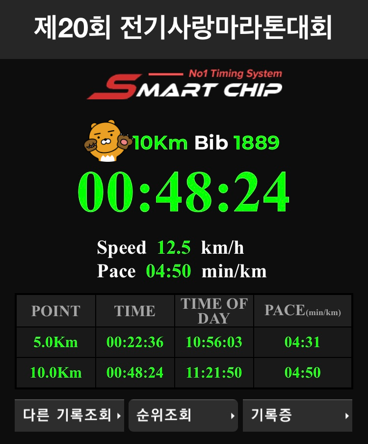 48분 24초. 첫 번째 참가한 10km 마라톤 인 것을 감안하면 나름대로 좋은 기록이다. 대략 상위 10%정도 된다.